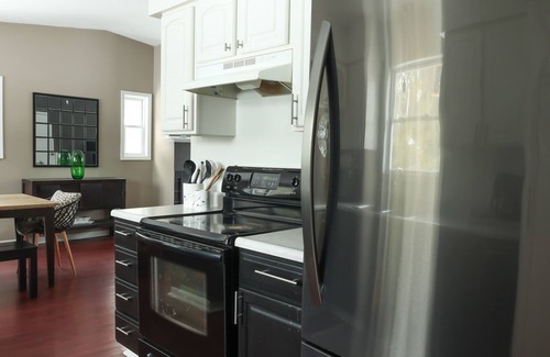Washer and dryer. Microwave, toaster, coffee maker, electric kettle, hairdryer, iron, flat iron. 55" Smart TV. Brand new full size fridge, brand new dishwasher. Kitchen stocked with: Dishes, pots, pans, and full rack of spices, coffee samples.