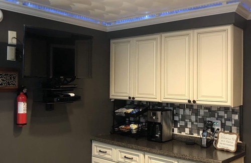 - Kitchen equipped with dishwasher (with detergent pods), refrigerator with ice maker, microwave, toaster/toaster oven combo, blender, tea kettle, coffee make, 4 burner electric stove. Wine glasses, Pots, pans, eating utensils, and grilling utensils provided