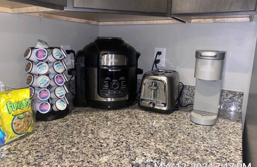 Fully-stocked kitchen features several small appliances, a dishwasher, stove, fridge and freezer as well as everything you would need to prepare a meal.
