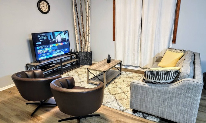 Upper-level Floor: Entering the foyer you are greeted with an open-concept kitchen, gleaming vinyl flooring, and rustic wood decor living area. The living area is designed with an artistic touch to make guests feel very comfortable. The walls feature neutral gray paint, and above, a modern close-to-ceiling decorative 3-light fixture. There is also a large window for natural light and a decorative X-frame rustic coffee table and TV stand. Guests can relax with a 65-inch 4K HDR TV with streaming apps Netflix, HBO, Youtube TV, Disney Plus, Youtube, Youtube Kids, PlutoTV etc.