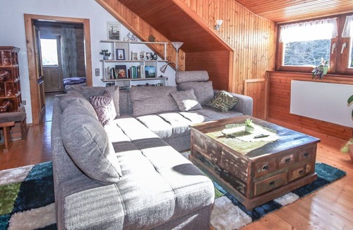 4-room apartment 110 m2, on the top floor. Object suitable for 5 adults. Spacious, partly with sloping ceilings, cosy and wooden furniture furnishings: large living room with satellite TV, radio and tiled stove. 1 double bedroom. Exit to the balcony. 1 double bedroom with hand-basin. Exit to the balcony. 1 room with 1 double sofabed (160 cm, length 200 cm). Large kitchen (oven, dishwasher, 4 ceramic glass hob hotplates, microwave, freezer, electric coffee machine) with dining nook. Bath/shower, sep. WC. Balcony. Balcony furniture. Beautiful panoramic view of the countryside. Facilities: Internet (WiFi, free). Please note: suitable for families. Non-smokers only. Smoke alarm. There is a video-monitored garage available. Protection for valuable vehicles.