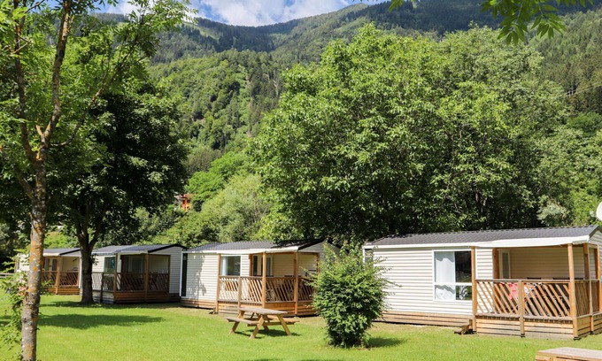 The "Wood Cube" mobile home features an exit leading to a roofed terrace measuring 9 square meters, complete with outdoor furniture for your enjoyment. From the terrace, you can appreciate picturesque views of the surrounding mountains and countryside. Internet access is provided via free WiFi, ensuring connectivity during your stay. Please note that this is a non-smoking accommodation. Additionally, a private mooring area is available at an extra cost.