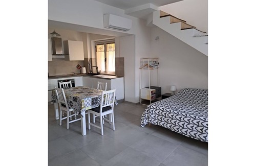 Open space: working desk, dining table, double bed, sofa bed double, WIFI internet, air conditioning, satellite tv, fridge, stove top, freezer, dishwasher, oven, toaster, italian coffee machine, american coffee machine, exit to the garden, exit to the patio.