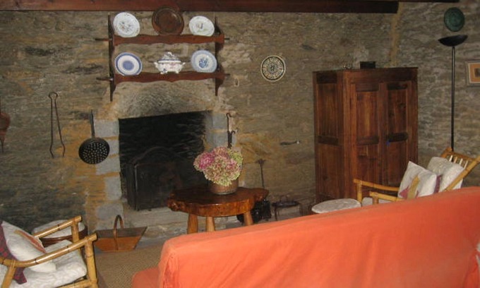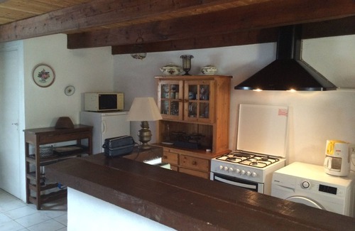 Character house for 4. Large living room of 40m2 with living room, fireplace, dining room and fully equipped kitchen overlooking a small garden