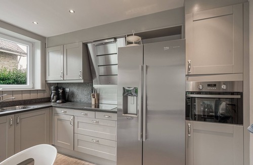 Layout: Ground floor: (hallway(toilet), Living room(TV(cable), seating area, DVD player, stereo unit, garden doors), Large kitchen(dining table, electric kettle, toaster, coffee machine, microwave, dishwasher, freezer), bedroom(bunk bed, TV, stereo unit), bathroom(bath tub, shower, washbasin))