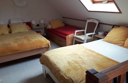 Through the front door you enter a cozy living room with a sitting area, double sofa bed, dining area and TV. The open kitchen has a microwave, oven, electric hob and fridge. Wifi freely available. Another hall leads to the bathroom with toilet, sink and shower, and the stairs to the top. There is a cozy and cozy bedroom with two double and one single bed.