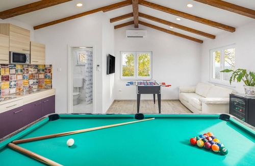 In the hills above the town of Buzet is located this vacation home. It is surrounded by greenery and fresh air and is suitable for those who prefer long walks in the unspoiled nature and fresh summer nights. Enjoying coffee in the morning or a glass of wine on the terrace in the evening will make your vacation even more pleasant with the view of the countryside. Right next to the pool, a summer kitchen also awaits you. One of the toilets of the house is accessible only from the outside. Visit Buzet and the surrounding towns like Groznjan and Motovun, which offer many events during the summer months.