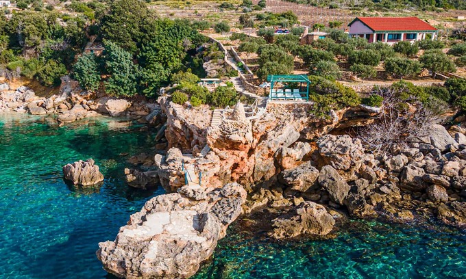 This functionally equipped vacation house, directly by the sea, is situated in a location where privacy is guaranteed. It is placed on a gentle slope, surrounded by greenery and well-kept garden with panoramic views of the Korcula channel and the mountain Sv.Ilija. The interior is furnished with handmade furniture adapted to the ambience and on the large covered terrace, which is connected to the barbecue area, you can prepare fresh home-caught fish. Under the house there is a path that leads to the sea and pebble beach between the rocks. Next to the beach is a cave that can protect you from the heat while the children swim in the sea. The owner offers with extra charge a small rowing boat with which you can row from the beach to the nearby camp with children's facilities, restaurant and bar. 500 m from the house is the Hotel San Antonio where you can also use for free the pool that you can see on one of the pictures. The last 200m to the property are not asphalted. We recommend a visit to the town of Korcula. Right next to the cottage is a small cottage with sauna, which brings additional relaxation on vacation.