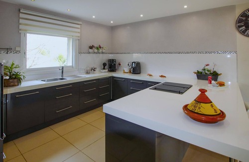 Welcome to this inviting house that offers ideal conditions for a fantastic vacation with family or friends. This Provençal style villa is close to all stores and in a very quiet residential area. The ambience of the house is bright and modern and offers many amenities. The sober and neat decoration with quality furniture provides the ideal setting for your relaxing getaway. The American kitchen, which opens onto a shaded climatic pergola, will be your privileged place for all your outdoor meals. One of the highlights of the house is the refreshing private outdoor pool, where you can swim undisturbed and then relax on the large south-facing terrace in a fenced garden with olive trees and palm trees.