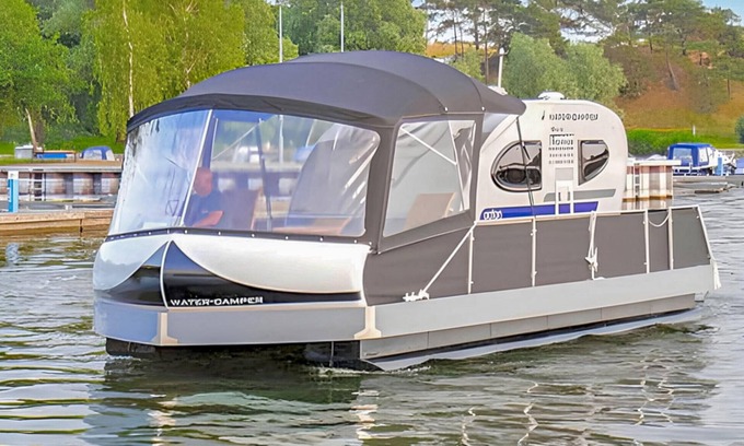 The water camper is simply and practically furnished. It is equipped with: Mini kitchen, 2 gas burners, fridge, coffee machine, dining area, radio, gas heating and garden furniture. In the caravan there are 2 fixed sleeping places in a cabin and an additional sleeping place for children in the tent on the foredeck. Ideally, the boot is suitable for 2 people. Thermal mats for tent use are provided by the owner, sleeping bags must be brought along.Houseboat / Type 1: (15 hp, 6 m², max. 3 persons, including 1 child), dimensions 7.70 x 3.00 m (total), 3, 70 x 2.10 m (living structure). Equipped with: Sleeping cabin, wet room, toilet (no shower), water tank (120 l). The total price includes: Charter licence, insurance, final cleaning, life jackets, bathing platform, electric starter, GPS, night lighting, boat charts, shore connection cable and parking. Petrol consumption is charged on the spot. After a detailed briefing on the handling of the boat and a test drive, you will receive a charter licence as authorisation to operate the boat. Experience an extraordinary holiday with a water camper! Here you can literally let yourself drift on Lake Kummerow and the Peene. Explore this idyllic water landscape in a unique way, stay where you like and enjoy your complete independence. The water campers are a new type of construction consisting of a catamaran substructure and a caravan. In the spacious bow area you will find enough space to have breakfast in the sun. This platform is protected by an all-round railing to ensure the safety of our little captains. There is a walkway all round with a sturdy handrail. Extra-large storage tanks and high-performance batteries give you the opportunity to spend several days without a shore connection and experience the Mecklenburg lakes and their unique nature up close.