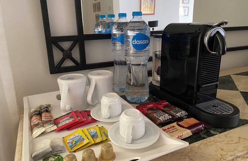 8- Espresso coffee machine is available at the dining side table, gust make sure that it is switched on through the upper buttons, wait a few seconds till the button light comes stable without flashing, open the upper door, put the coffee capsule, make sure that there is enough water in the back tank, then push the button to get your coffee.