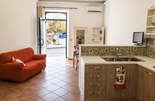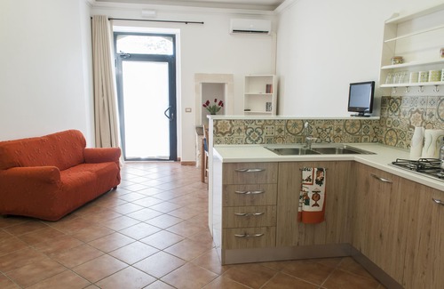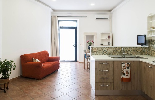 Historical renovated apartment with ample space for sharing and relaxing, with TV and sofa, a large double bedroom, a single room, fitted kitchen, two bathrooms with shower and small inner courtyard. It offers free Wi-Fi, TV and air conditioning. Suitable for families with children and young vacationers looking for adventure, the apartment is located in Solarino, a village near important archaeological sites, naturalistic and UNESCO heritage sites.