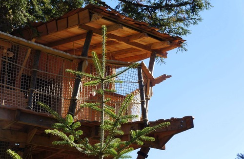 This is the highest tree house of the domain (12m60) in the most impressive tree… it dominates the Bourboule Valley situated in a beautiful landscape with the surrounding mountains. To access it, you will take stairs, ladders and then a 20-meter-long footbridge. On arriving no-one will bother you, save the forest birds. Nis de Bisou in the local dialect means the nest of the Bisou, Bisou the name given to the wind that will rock you during the night. This tree house has a deck on which you will be able to enjoy the landscape with dinner and breakfast.