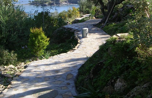 Firstly, a foot path which is a little steep and rocky in places but easily manageable. It is a 10 minute walk and takes in stunning views of mountains to the left and right with a sea vista of (on a clear day) the island of Kythera over 40 km away. The second way is a rough track a kilometre in length which starts just to the West of the car parking area through the sheep farm. Using this track the Kawasaki Mule 4WD (available for the use of the guests) or any small 4WD vehicle can carry people and goods between the car parking place and the house.