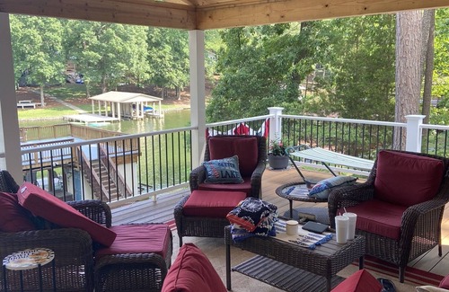 Outside, the upper covered deck is equipped with tables and plenty of seating when grilling out on the gas grill while viewing the wide open view of the lake. The outdoor fire pit is perfect for family marshmallow roasting and story telling. The dock includes an upper sun deck and large main deck. There is tie up space for a boat on the side of the dock. We also have electrical outlets on the dock. A neighborhood launch is located about 3/4 mile away. The water depth at the end of the dock is about 8 feet.