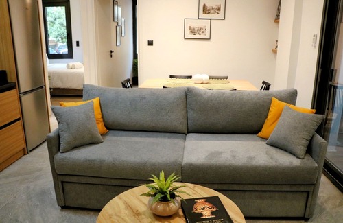 Bright and spacious, featuring a comfortable sofa (which converts into a bed), a Smart TV, and a dining area — perfect for relaxing, dining, or getting some work done.