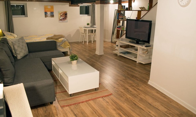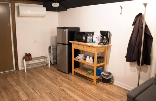 This spacious 550 sq. ft. and fully equipped private studio apartment is on the ground level of our house. It has a private entrance located on the back of our house, private bathroom, comfortable queen size bed (sleeps 2), a pull-out couch (sleeps 2), a dining area and a kitchenette. The kitchenette has a microwave, coffee maker and a fridge. We also have utensils, plates, glasses and mugs. You can prepare basic meals, such as sandwiches and oatmeal, but please note there is no stove or a hot plate and you will not be able to cook. The studio has its own heating and cooling system, which is controlled separately from the main house. Our street is very well lit and has free parking on first come first serve basis. We offer a washer and a dryer upon request for a fee.
