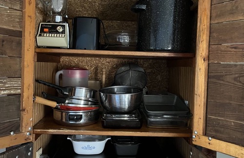 The cabin is a 2 bedroom, one bathroom setup arranged with an open floor plan and large windows that overlook a small private lake. When you drive in, you’ll notice that it’s built up on large “stilts” like a beach house, and you can park and unload your things right underneath!