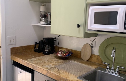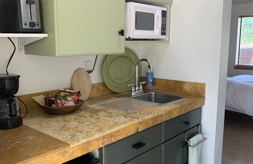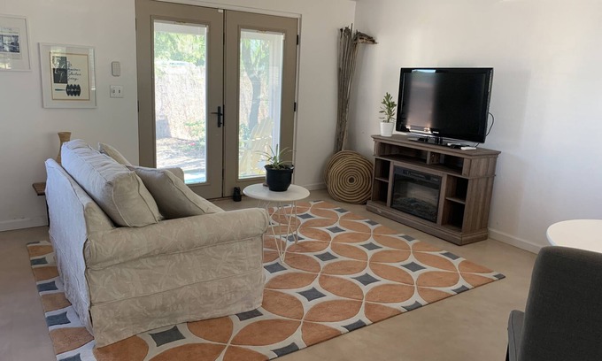 It has a private fenced yard and a covered patio. A view of the mountains can be seen from the patio and through the windows. There is a kitchenette with coffee/tea, and creamer. A microwave, hot plate, 5-cup coffee maker, toaster, water kettle and fridge and freezer with ice are provided. A Brita filter provides clean drinking water. A table and chairs accompany the kitchenette. There is an electric fireplace in front of the sofa which holds a TV with ROKU (please bring your log-in information to stream). There is also an antenna for local channels. One of the apartments best features is the bathroom with a large walk-in shower made of travertine stone. The apartment is exceptionally cleaned for you and the new concrete floors make it feel very open and fresh. There is a large closet for storage. The studio is attached to the main house which has a pool, and the pool is available to you upon request (it is not heated). This studio has it's own entrance and parking spot in front. Please ask the host for any needs that may arise as we want you to enjoy your time.