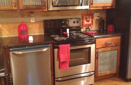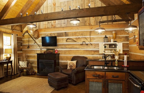 Beautiful log cabin. Sleeps 4. Master has a queen bed, closet, dresser and tv. Loft has 2 twin beds. Kitchen is fully furnished, granite counters, bar, stove, dw, refrig, and microwave. Enjoy the complimentary coffee. Full size bath with shower/tub combo. Den has tv over gas fireplace. Enjoy the peaceful setting rocking on the front porch and watching friendly horses next door.Free WiFi (watch our new video!) NO PARTIES OF ANY KIND ALLOWED.