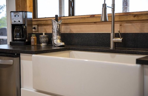 If you are looking for a great little hill country cabin in the Hill Country then check out the AMAZING Texas Haus. The Texas Haus cabin has all the comforts of home. You'll enjoy an open floor plan centered around a king size bed with beautiful linens. You'll also appreciate the full kitchen, dining area and cozy sitting area complete with a cozy fireplace. As the Texas Haus is a private cabin, you will of course have your own private bathroom with stand alone shower and gorgeous jetted tub.