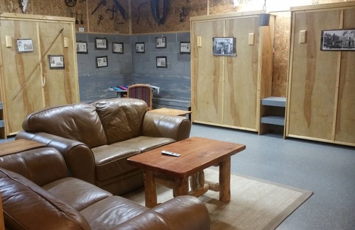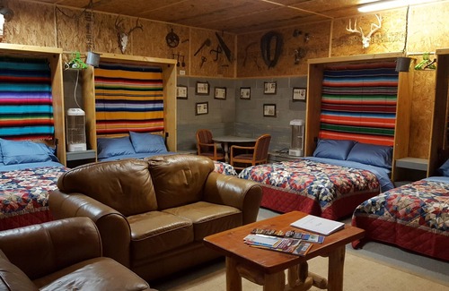 Our bunkhouse is situated approximately 75 feet from the Homebase . Both are located at the base of Nogal Peak on five acres with National Forest on three sides. It is surrounded by beautiful Ponderosa pines with a natural creek running through the property. If you like camping but prefer some of the comforts of home, this is the place for you. Rustic yet comfortable is this 550+ sq ft open concept cabin. For the hunters this is unit 36.