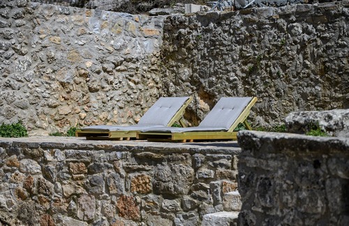 Outside, you'll find a delightful stone courtyard with a garden and a swimming pool, offering a unique unobstructed view of the surrounding area.