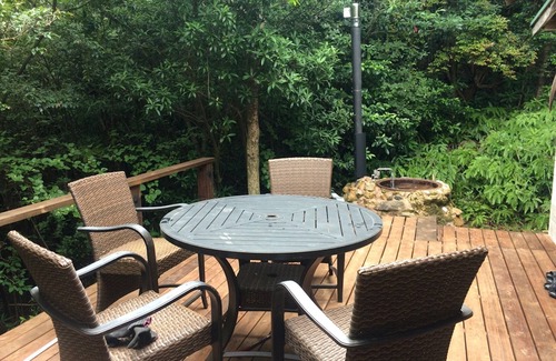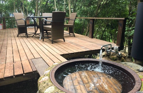 Located on the coast of the Pacific Ocean the vast grounds of 50000 tsubo are not only a campground lodging facility and cafe but also an untouched virgin forest and an attached organic farm / A private inn located at the top of a virgin forest mountain A private Goemon bath is installed on the wooden deck and guests can heat their own firewood to heat water for the bath Up to 2 infants can sleep together