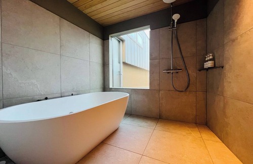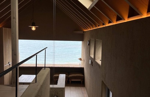 We provide a counter table and a spacious sofa on the ocean side On the upper floor there is a tatami room where you can lie down so you can enjoy the sea wherever you are You can enjoy the view during the day and at night you can lower the screen on the large window and use it as a projector / There is a bathroom overlooking the Sea of Japan a bedroom with earthen walls and a low ceiling reminiscent of a cave and a door on the other side that leads to the deck allowing you to enjoy the view of the Sea of Japan while you relax
