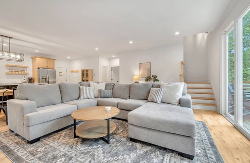 The main floor of the home features a spacious living room with a large TV, a dining table that seats 8, kitchen island seats 4, and a fully equipped kitchen. There are 3 enormous bedrooms, each with their own private full bathroom. The primary bedroom is on the main floor and has its own private bathroom with beautiful custom walk-in shower. The two suites upstairs each have their own bathroom with walk-in custom tiled showers. One of the upstairs bedrooms has two queen size beds, and the other upstairs bedroom features two queens, and twin over full bunk bed, this bedroom is perfect for a large family of 7. The basement game room is the perfect place to relax after a long day of enjoying the lake or hiking. It features a large TV, foosball table, bar top table to play board games, two arcades (child-size Pac-Man for children and NBA Jam for adults), and sectional that pulls out into a bed to sleep two (perfect for kids or teens).