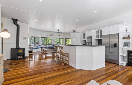Tastefully styled and furnished with quality décor and linen, Noosa Gums is perfectly suited to gatherings of families and friends with its large air-conditioned open plan kitchen, living and dining space with a large communal dining table and bench seating plus a Coonara style wood heater for the cooler months. The fully equipped kitchen features a 6 burner gas hob, double oven, dishwasher and French cabinet fridge with a second fridge in the garage. Outdoors is a Weber Q BBQ and a dining setting allowing guests the option to dine or enjoy a sundowner outside in a peaceful, serene and totally private bush setting.