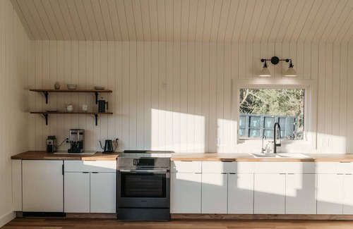 A vaulted ceiling in the living room, kitchen, and dining area provides a space of imagination and freedom while the nest-like bedroom is a place of privacy and refuge. Floor to above-head-height windows all along the house’s south wall admit sun in a play of light and shadow that works its way across the floors and washes the walls throughout the day. Morning light filters through tree branches and leaves into the bedroom’s eastern window. Evening sunsets fill the dining area’s bank of western windows. Views of the surrounding meadows, orchard, and forest are available from any vantage point in the house. Windows and doors swing wide open to create a permeable boundary between inside and outside and provide cross ventilation in warm seasons. A wood burning fireplace anchors the living space and is the vital heart of the house in cool and cold weather.