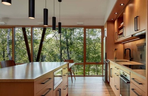 Perched high on a bluff over the hidden lake, LongHouse is the perfect getaway. This one-story, 1,200 sq.ft. cabin has one king bedroom, one queen bedroom, and two bathrooms. Floor to ceiling glass brings the outdoors inside, and each season brings its own unique perspective. Traverse the bridge over a dry creek bed and enjoy water views from a large screen porch. Staying in LongHouse is truly a one-of-a-kind experience.