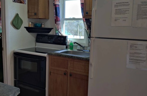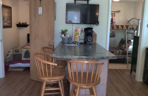 Located on Norfork Lake Arkansas, Keller;s Kove Resort, cabin 2 is a 2 bedroom, 1 bath unit, 384 sqft. sleeping up to 4 persons. An island with 3 bar stools separates the kitchen from the living area. The island has built-in cupboards and drawers which includes pots, pans, dishes, and flatware. The bathroom has a one-piece shower stall. New vinyl plank flooring, new windows, mini split for A/C and heat. Covered patio with picnic table, BBQ/grill, firepit and private parking. There is an onsite coin operated laundry as an added convenience. A quick 5 minute walk to the boat dock which includes a swim platform for lake swimming or fishing. Golf cart rentals are available and if you forgot any amenities, check out our camp store which also includes beer sales. Bring your boat and spend the day at Sand (Jordan) Island, which is the place to take a break from the lake, swim, stop for lunch or hook up with friends.