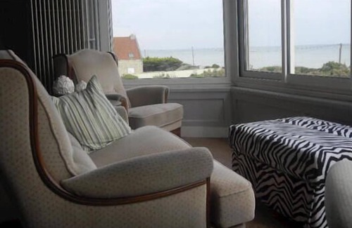 The Living Room: The salon is a very large room, with a 10 foot cove ceiling and fabulous views of the sea from the very large bay window. You will be able to see the sea from 90 degrees to the north, east and west. Two very comfortable chairs are strategically placed at the window for the best views in the house, and a lovely place for an afternoon tea and a cozy read or a glass of wine at sunset. The room is very bright and sunny.