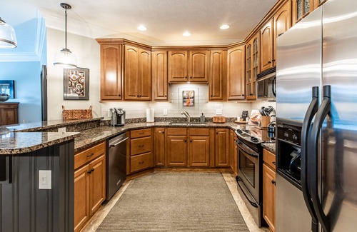 Gourmet kitchen, with its rich granite counter tops and convenient breakfast counter, stores all the appliances, dishes, and utensils needed for feeding family and friends. Keurig and two other coffee makers, toaster, electric griddle, crock pot and many other kitchen accessories are stocked for use. Additional seating is available at the dining room table or patio table on the covered balcony. Outdoor propane grill awaits the grilling enthusiast!