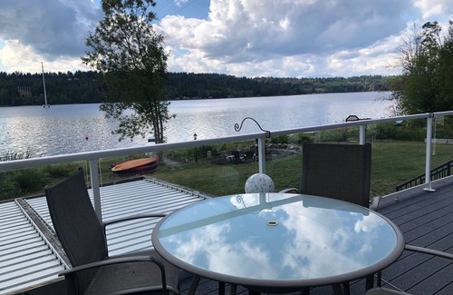 Perfect for your beach vacation. Stroll the beach, dig for clams or oysters while the tide is out, and then kayak or paddle board when the tide comes in. Dine on the deck, then roast marshmallows by the bonfire! You may see bald eagles, harbor seals, otters, or possibly even orcas! Enjoy the view from the deck or great room. See through fireplace, gourmet kitchen, jetted tub, vacation in style!