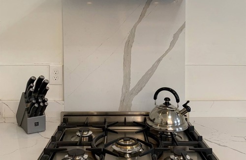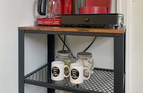 Two fully equipped kitchens, one full size in the cottage and one mini size in the suite. Fridge, microwave, oven, and small appliances in both units. The cottage has a gas cooktop and dishwasher. Kitchen small appliances include toaster oven, pop up toaster, Keurig, coffee maker, coffee grinder, blender. Dinner plates, salad plates, bowls, cups, glasses and wine glasses, all types pots and pans.