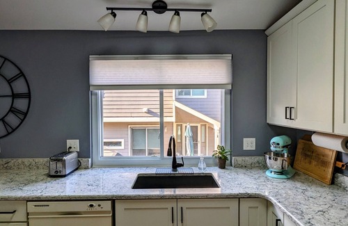 The house itself is beautifully decorated and features all the amenities you need for a comfortable stay, including a fully equipped kitchen, a cozy living room with a fireplace, an office space with two large monitors attached to a standing desk, and a partially-fenced backyard with a patio.