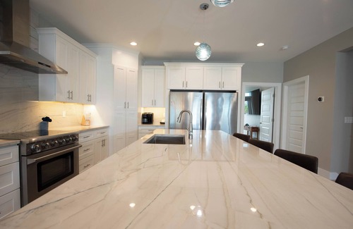 *Gourmet kitchen with large quartz island, gas stove, stainless appliances, two refrigerators/freezers, and plenty of serving/pantry items