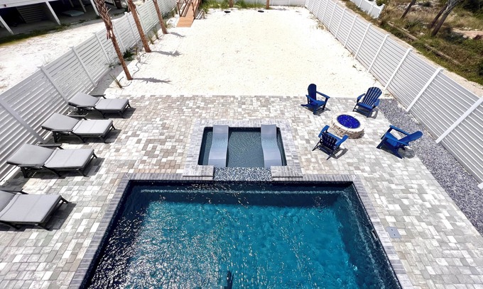 This 2023 build on the north end of Cape San Blas will wow you with its spectacular gathering spaces and huge fenced yard with a private luxury inground pool! This home was built with large groups in mind and boasts two dining tables, two refrigerators, large commercial ice maker, a living room and a large family/game room complete with arcade and TV. The built-in bunk beds are queen sized and all bedrooms are ensuites. The private gated boardwalk extends all the way to the beach for easy access to the gulf where you will be “Sippin’ Sunsets”!
