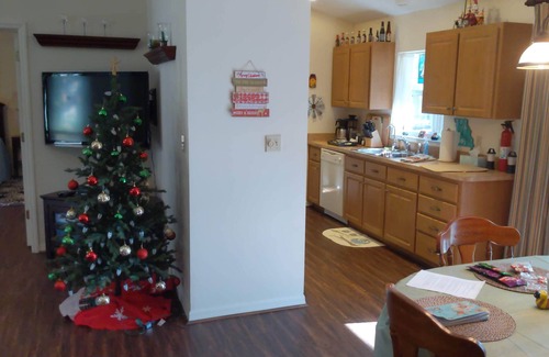 A cozy 2 bedroom, 2 full bathrooms, full kitchen home with a front porch, back patio, front yard and backyard, located on 5 acres, surrounded by woods. Self-check-in with a door code for your convenient arrival.