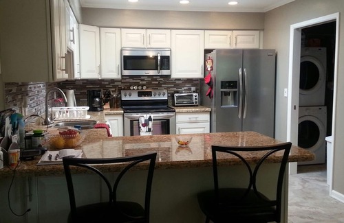 Recently remodeled from top to bottom with everything finely appointed, constructed and decorated. Beginning with the new luxurious all electric gourmet kitchen with all new stainless Frigidaire appliances--refrigerator thermostat controlled on the front panel with reverse osmosis in the door, ice maker dishwasher, stove, microwave, stainless sink, gorgeous granite counters with bar seating. Brand new off white with chocolate glazed cabinetry and an extra pantry area in addition to the walk-in. Back splash in european glass with stainless. Huge skylight in the kitchen for adequate lighting plus can lighting on dimmer, hunter fan, walk-in pantry, separate 27" front-end load washer and dryer also new with all the laundry and sink/dishwasher condiments. Fully stocked with pans, cookware, dishes; everything you will need and then some; if you need more for additional guests or event or holiday guests, we can add more to accommodate the headcount. Kitchen also has another separate parson's dining table with expansion to sit additional guests. Sides pulled up create a round table. Front kitchen windows have plantation wood shutters. Adjacent in the formal dining area is a brand new heavy dark mahogany wood table--seating 8 with expandable leaf to seat 10; light fixture has dimmers as well.