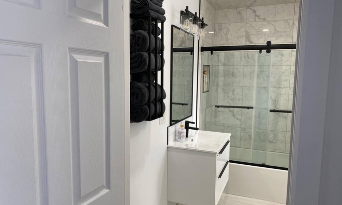 BATHROOM: Floating vanity. New tub with glass shower doors. Shampoo, conditioner, and body wash are provided.