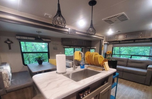 Modern camper that sleeps 4 nestled next to the Ouachita National Forest. Spacious living area and kitchen. Electric fireplace. Patio area overlooking Billy Creek with firepit to gather around.