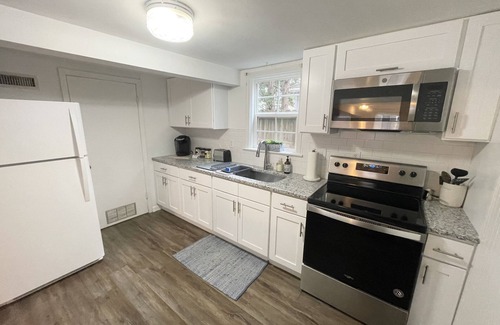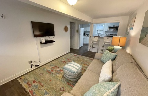 This apartment has 1 bedroom with a queen bed, 1 full bathroom, living room with sleeper sofa and a TV, and a newly renovated kitchen. Located on the 1st floor and has a private entrance. There is free street parking, as well as a small yard and patio. Guests have access to shared bikes and a grill. Linens and towels are included.