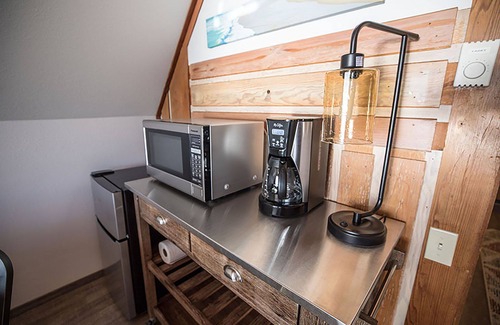 North Loft amenities include queen bed, full-size leather couch, 39" flat screen TV with Spectrum Silver channels and Blu-ray player, free local and long-distance phone service, high speed Internet/Wi-Fi, microwave, coffee pot, small refrigerator/freezer, hair dryer and deck chairs.