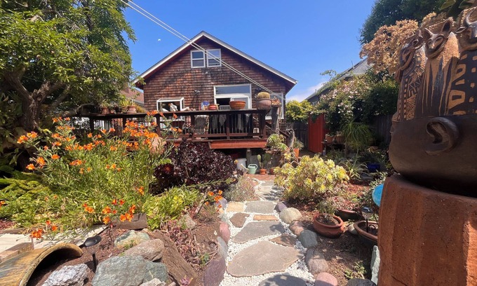 Enter the 1912 Craftsman home off of the classic front porch into the relaxing living room with smart tv, walkthru an office/sitting room, to a fully stocked open floorplan kitchen/dining with deck access for outdoor dining, bbq, and lounging. Two spacious bedrooms-one King and one queen w two full baths-one w tub/shower and one w walkin shower, offer privacy from each other in the home. Gorgeous oasis garden with amazing sculptures for exploration in the secluded, enclosed backyard. Owners curated collection of art are featured through out home for your enjoyment.