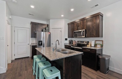 Your North Ogden adventure starts here! 3BR, 2.5BA townhome w/mountain views, 75" smart TV & sleeps 8 (king, queen, twin trundle, sofa sleeper). Shoot hoops or play pickleball on-site! Got a bigger group? Book our 2nd townhouse nearby.