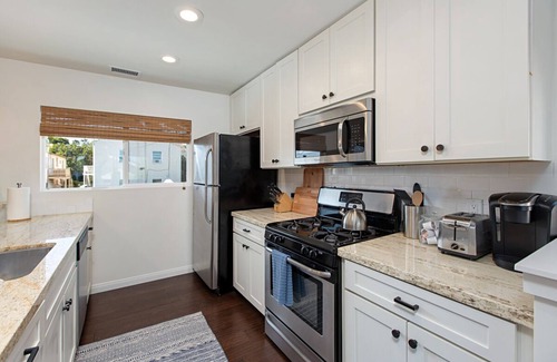 This beachy modern guest house is a dream! Two bedrooms with queen beds and pull out sofa in the living room. Light and bright with ocean breezes. Walk just three blocks to the beach. You are in the heart of North PB, close to restaurants, coffee shops and boutiques. Owners are attentive and live in the front house. This is not a party house, we respect our neighbors. Great WiFi for those looking to work or study remotely! Special note, this guest house is above our garages, you may hear the garage door open. We have security cameras outside to monitor the property.